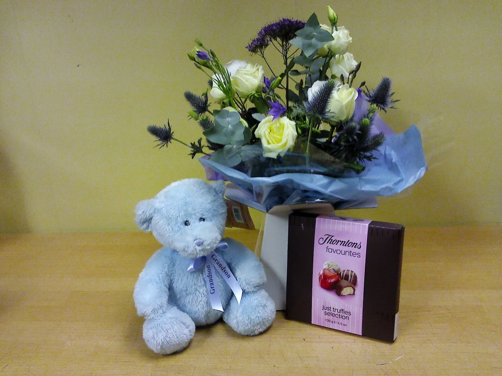 Complete with a soft teddy and chocolates.