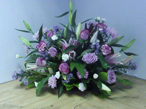 Funeral spray of fresh flowers in oasis.